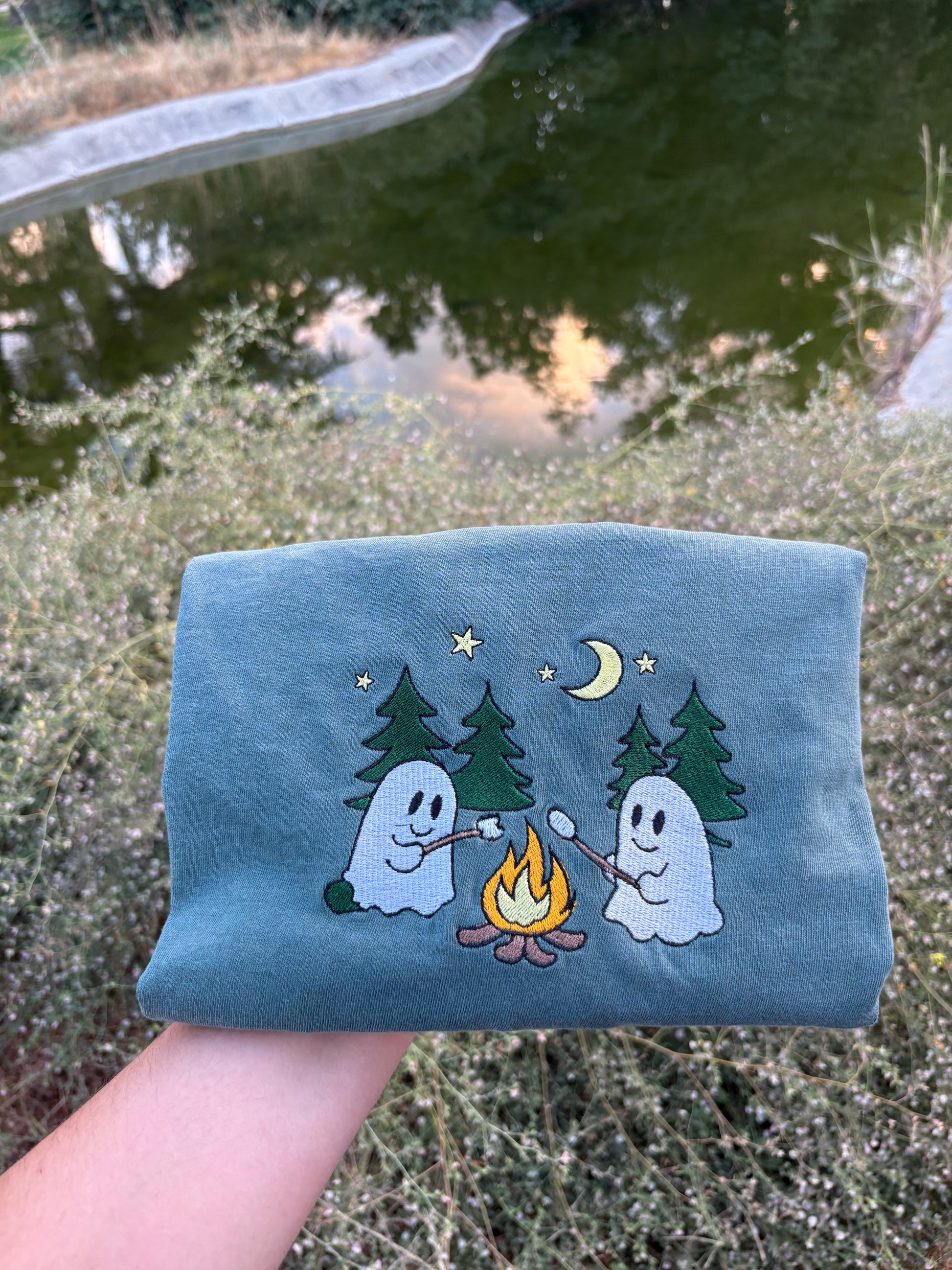 Spooky but sweet: two tiny ghosts, a crackling fire, and a starry sky. The embroidery pops against the soft, garment-dyed Comfort Colors tee. It’s the kind of shirt you’ll wear on repeat all fall.