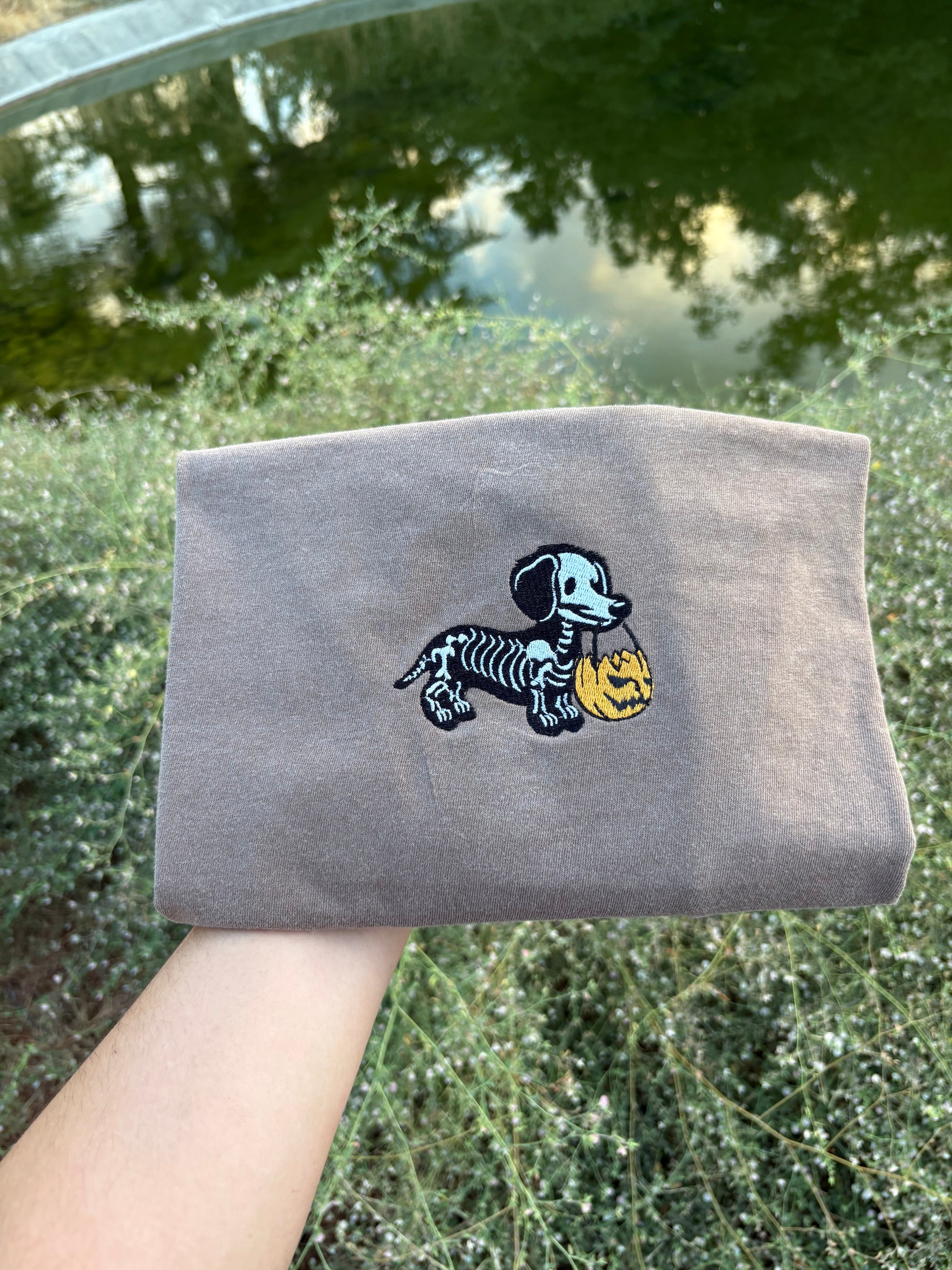 A tiny skeleton dachshund carrying a jack-o’-lantern? Pretty much the cutest kind of spooky. This embroidered design on a soft, garment-dyed Comfort Colors tee is perfect for trick-or-treating, pumpkin patch trips, and showing off your Halloween spirit all year long.
